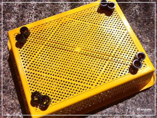 浅型のプラかごに足になるプラスチック部品(うちでは水道パイプまわりの部品からみつくろって利用)を取り付けてペレットの砂を振り分ける中箱に。