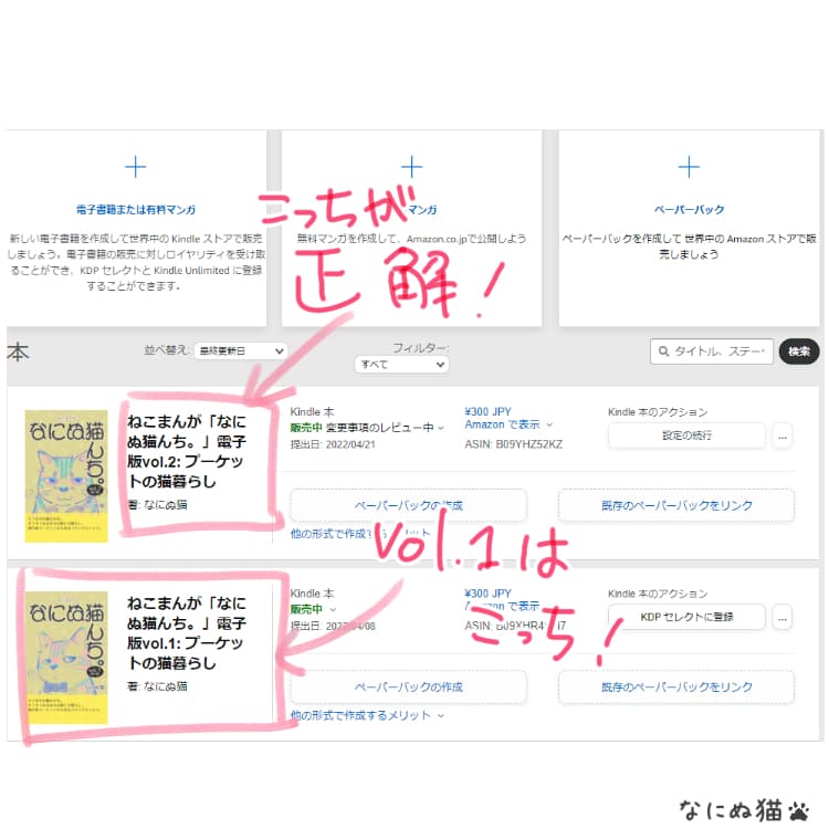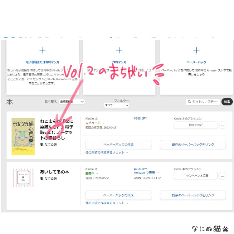 結局何度かのメールのやりとりと登録情報の再入力(メールと実際の画面の反映に妙なタイムラグがあって右往左往しました)にほぼ一日かかってなんとか正しいタイトルで再販することが出来ました。
