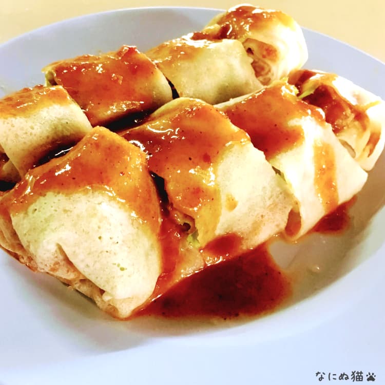 実はタイの生春巻きは2種類ありまして、もう1種類はクレープ状の透けない皮で煮野菜などを包んでみたらしに似た甘酸っぱいタレをかけていただきます。